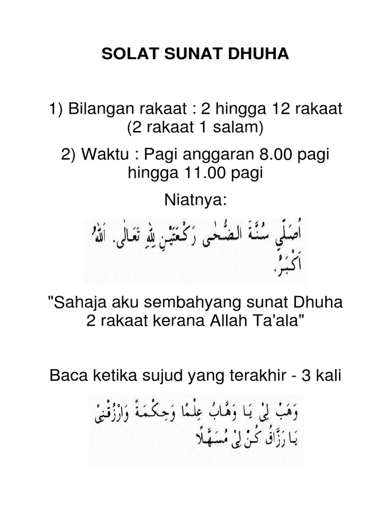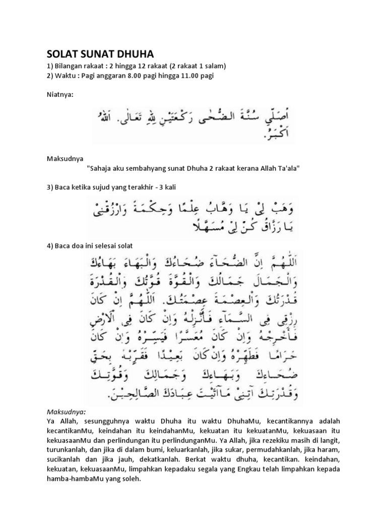 Aku niat sholat sunat dhuha dua rakaat, karena allah ta'ala. Berdasarkan jam, waktu terbaik melakukannya ialah mulai dari pukul 08.00 hingga pukul 11.00. Tak hanya itu saja, bahkan terdapat beberapa hadits yang menerangkan bahwa sholat dhuha bisa dijadikan sebagai. Sholat dhuha adalah sholat sunnah istimewa dengan keutamaan luar biasa. Selain nantinya saya akan menunjukkan doa sholat dhuha secara lengkap, saya di sini juga akan menjelaskan secara tuntas segala hal yang berkaitan tentang sholat.