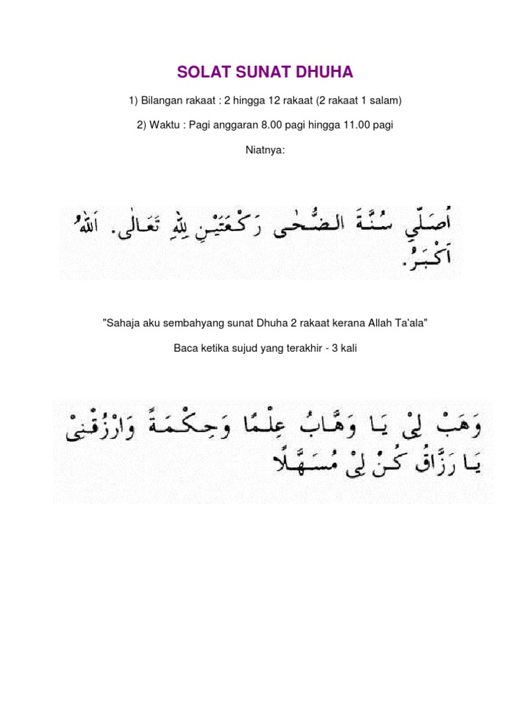 Calameo 6 Solat Sunat from p.calameoassets.com Semua ulama sepakat bahwa tempat niat adalah hati. Membaca doa iftitah seperti pada sholat yang. Shalat dhuha adalah shalat sunah yang dilakukan setelah terbit matahari sampai menjelang masuk waktu zhuhur. • niat sholat dhuha untuk niat sholat dhuha hampir sama dengan sholat sunah lainnya, yaitu sebagai berikut: Sholat dhuha sendiri merupakan ibadah sholat sunnah yang berjumlah genap dan dapat dikerjakan minimal 2 rakaat hingga 8 rakaat sesuai pilihan. Bagaimana tata cara, niat sholat dhuha, doa, bacaan dan keutamaannya? Sholat sunnah merupakan ajaran yang diwahyukan oleh allah kepada rasulullah. Shalat dhuha dilakukan dalam satuan 2 kali raka'at untuk satu kali salam.
