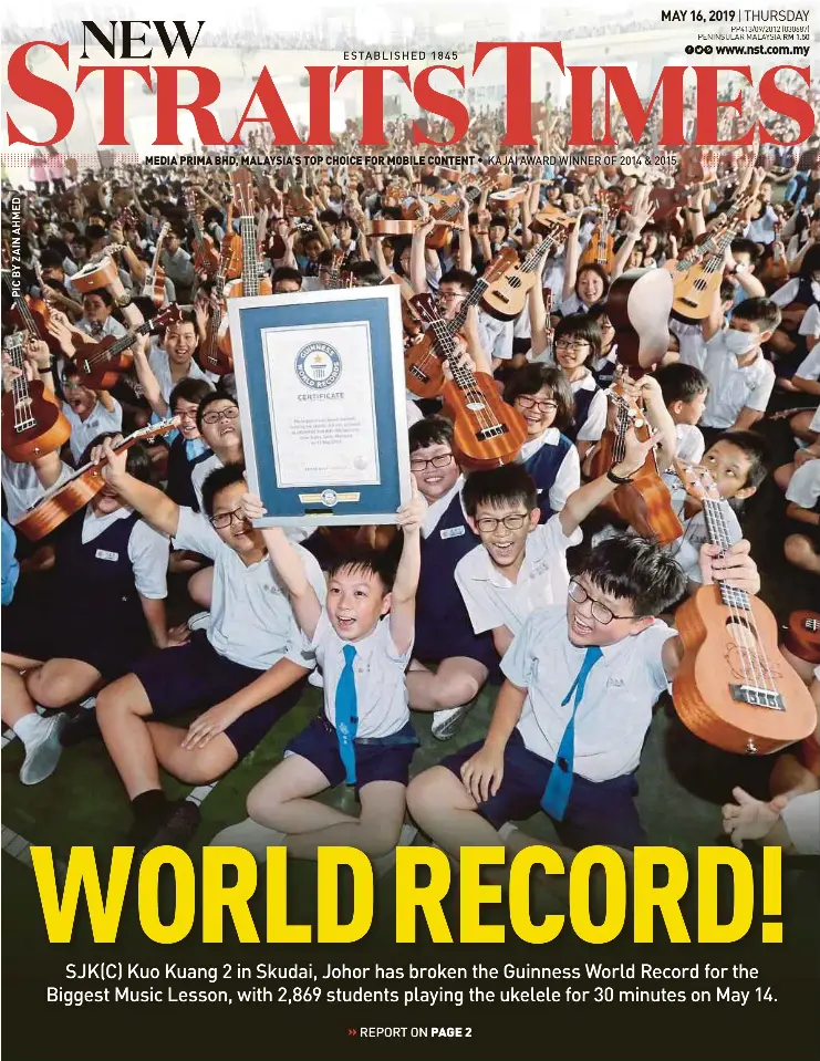 Sjkc kuo kuang 2 in johor baru successfully put itself in the guinness world record on wednesday with 2,869 of its students learning and playing the ukulele at one time.