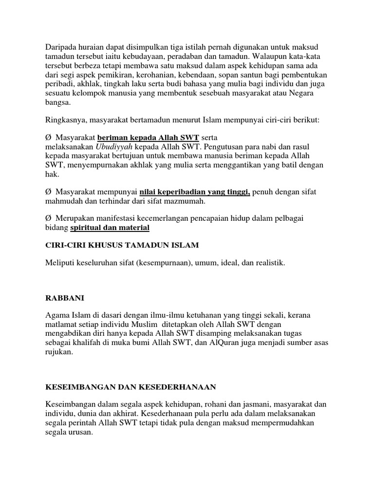 Membantu mempercepatkan proses penyebaran kebudayaan islam dan meningkatkan perkembangan ilmu yang. Dalam tamadun islam kesemua ciri ini berasaskan agama. Perkataan manusia rabbani, contohnya, membawa maksud, manusia yang berpengetahuan tentang allah, berpegang teguh dan beramal dengan ajaran allah. Tamadun islam yang mengalami proses pembinaan yang agak lama tentunya memberi ruang kepada peradabanperadaban lain untuk. Now we recommend you to download first result ctu151 bab 1 ciri ciri tamadun islam mp3.