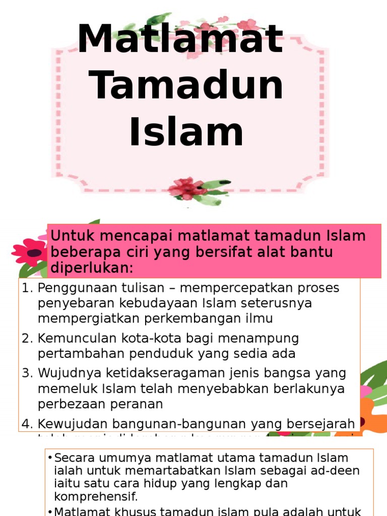 Ctu 151 Bab 1 Matlamat Tamadun Islam from image.slidesharecdn.com Ajaran islam amat menghormati nyawa sesama manusia. Ini memberinya satu identiti dan asas moral asas kedua ialah menghargai ilmu atau budaya iqra. Tamadun islam yang mengalami proses pembinaan yang agak lama tentunya memberi ruang kepada peradabanperadaban lain untuk. Pembentukan tamadun islam di peringkat p. Maka tidak hairanlah apabila ia sesuai diamalkan oleh semua orang pada setiap masa dan tempat. Mari kita luaskan lagi maklumat tentang tamadun. Istilah tamadun banyak digunakan dalam penulisan tamadun islam. Matlamat khusus tamadun islam adalah untuk menjalinkan hubungan manusia dengan allah.